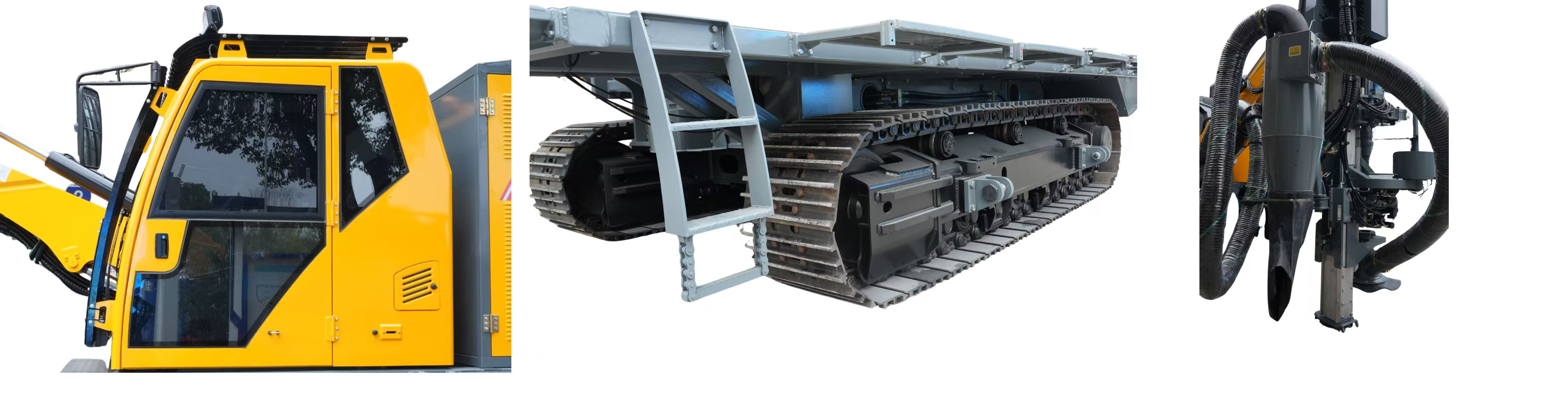 配有液压卸杆机构拆卸钻杆,浮动接头保护钻杆螺纹,自动接卸杆器减轻劳动强度,空调驾驶室提供舒适的工作环境及自动控制防卡阀减少卡钻机率;