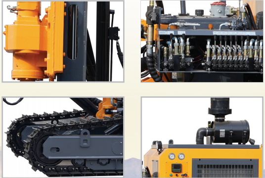 • Equipped with 1 ton frame winch for feed(optional), convenient for hoisting drill bit and drilling tool,impact device, etc. When used on large slopes, you can choose to use 8-ton frame winch for rig(optional) to ensure sufficient traction when using the drill rig.